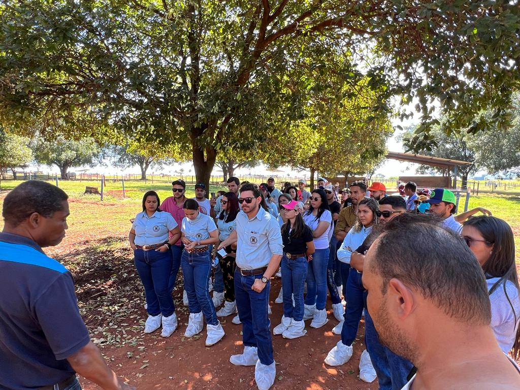 A visita iniciou na Agropecuária Diamantino, onde os acadêmicos tiveram a oportunidade de conhecer o sistema de produção de gado PO (Puro de Origem), as baias e estratégias de comercialização, uma vez que foi montada uma feira de negócio na propriedade para a comercialização de animais, para 88º ExpoZebu.