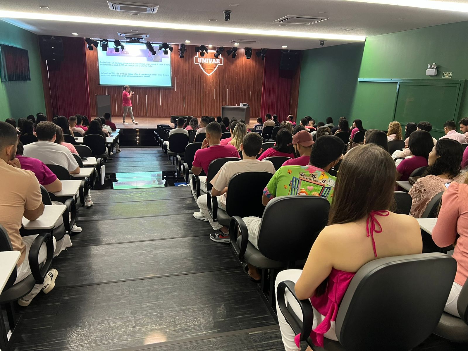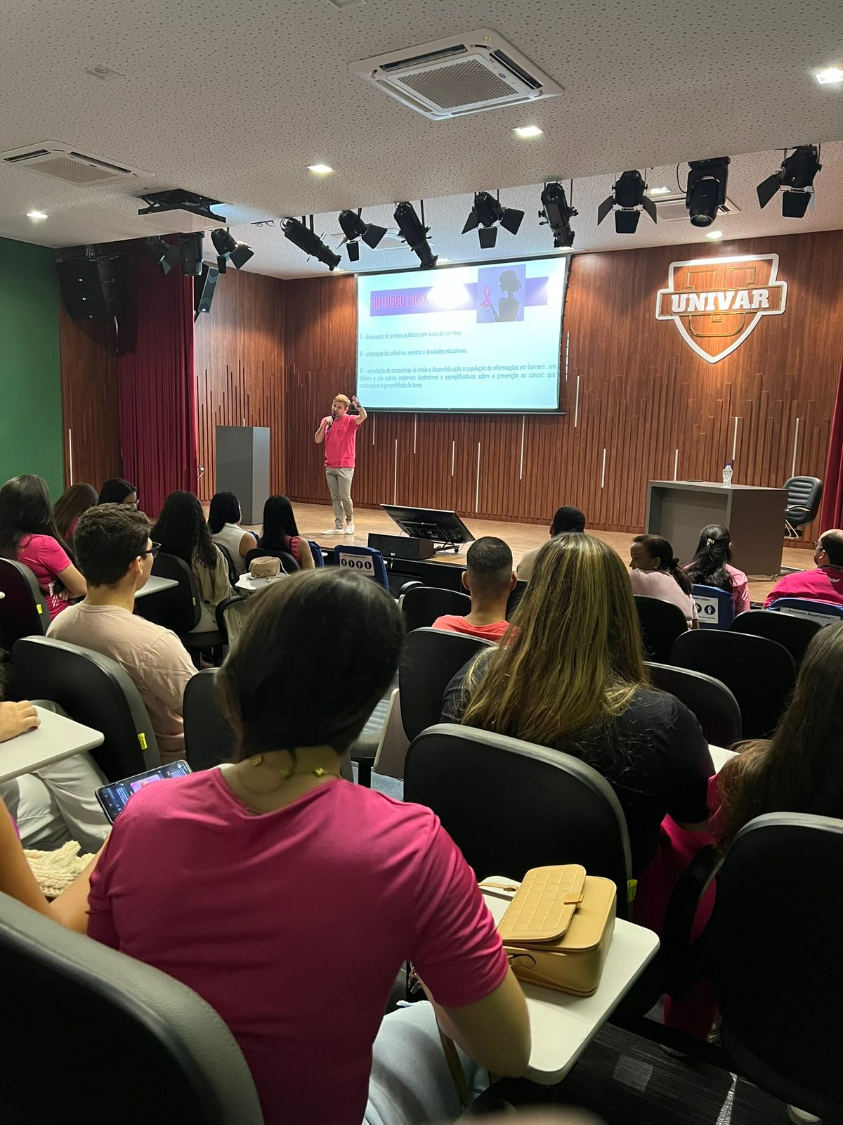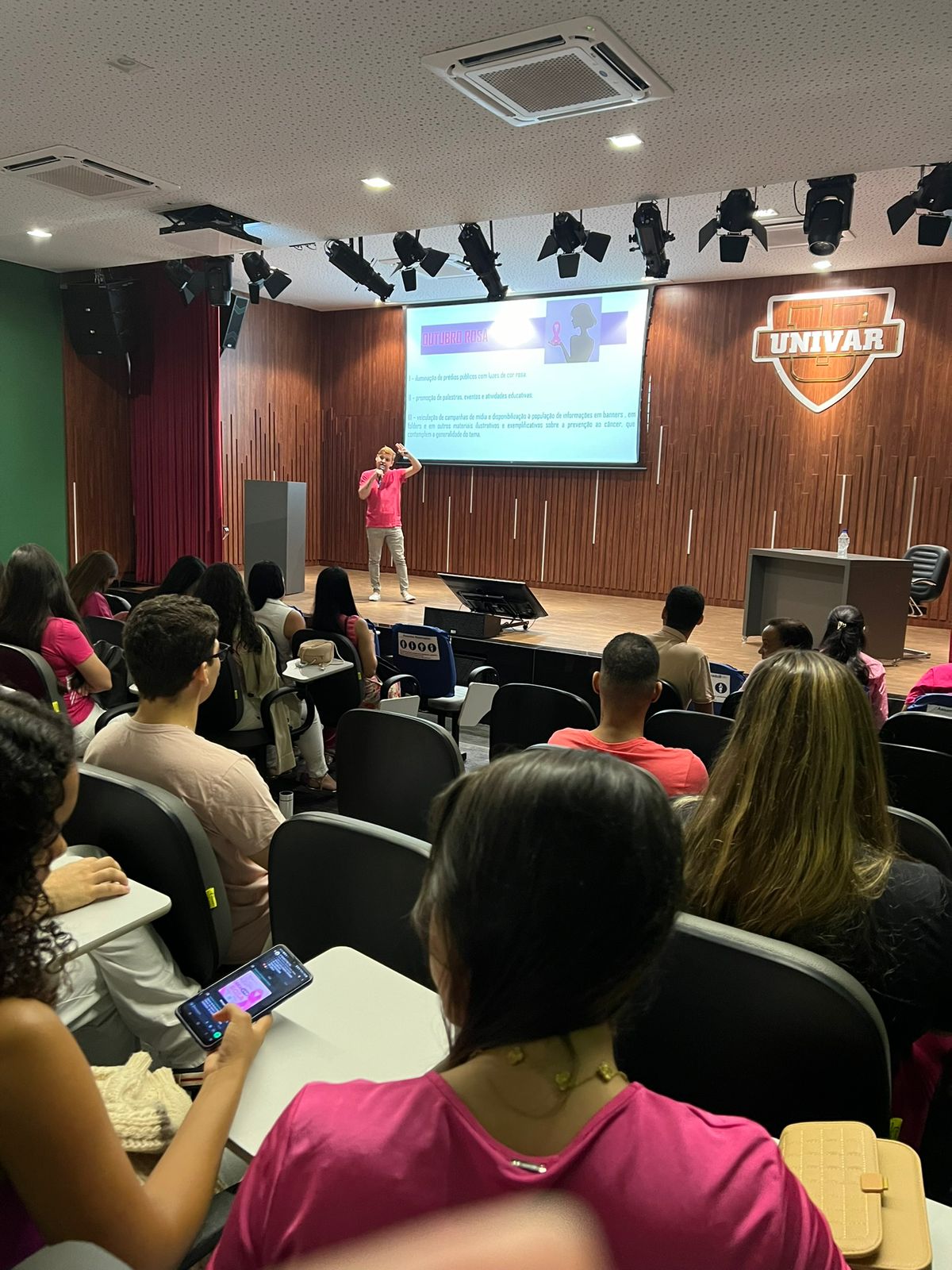 O Centro Universitário do Vale do Araguaia realizou hoje, 24/11, no auditório João Bosco de Aquino Araújo, a palestra “Prevenção ao câncer de Mama”, parte do projeto de extensão interdisciplinar “Integrando a Odontologia ao SUS”. A ação, denominada “Odonto veste rosa”, integra as atividades do Outubro Rosa, campanha nacional de conscientização sobre a prevenção ao câncer de mama.