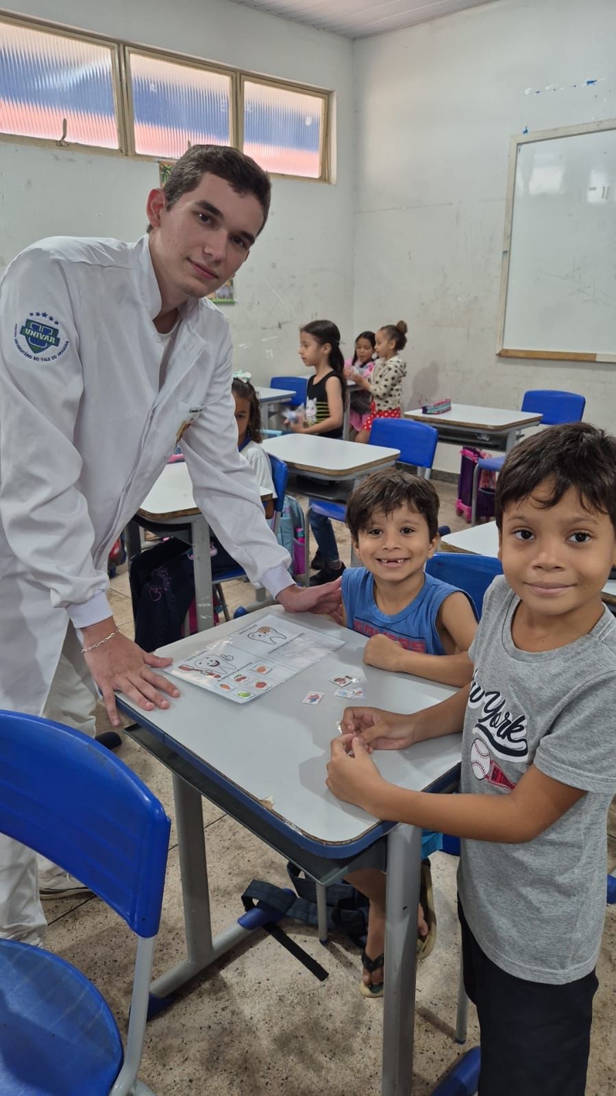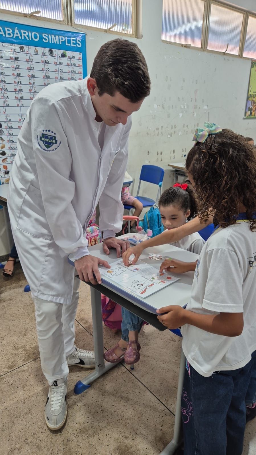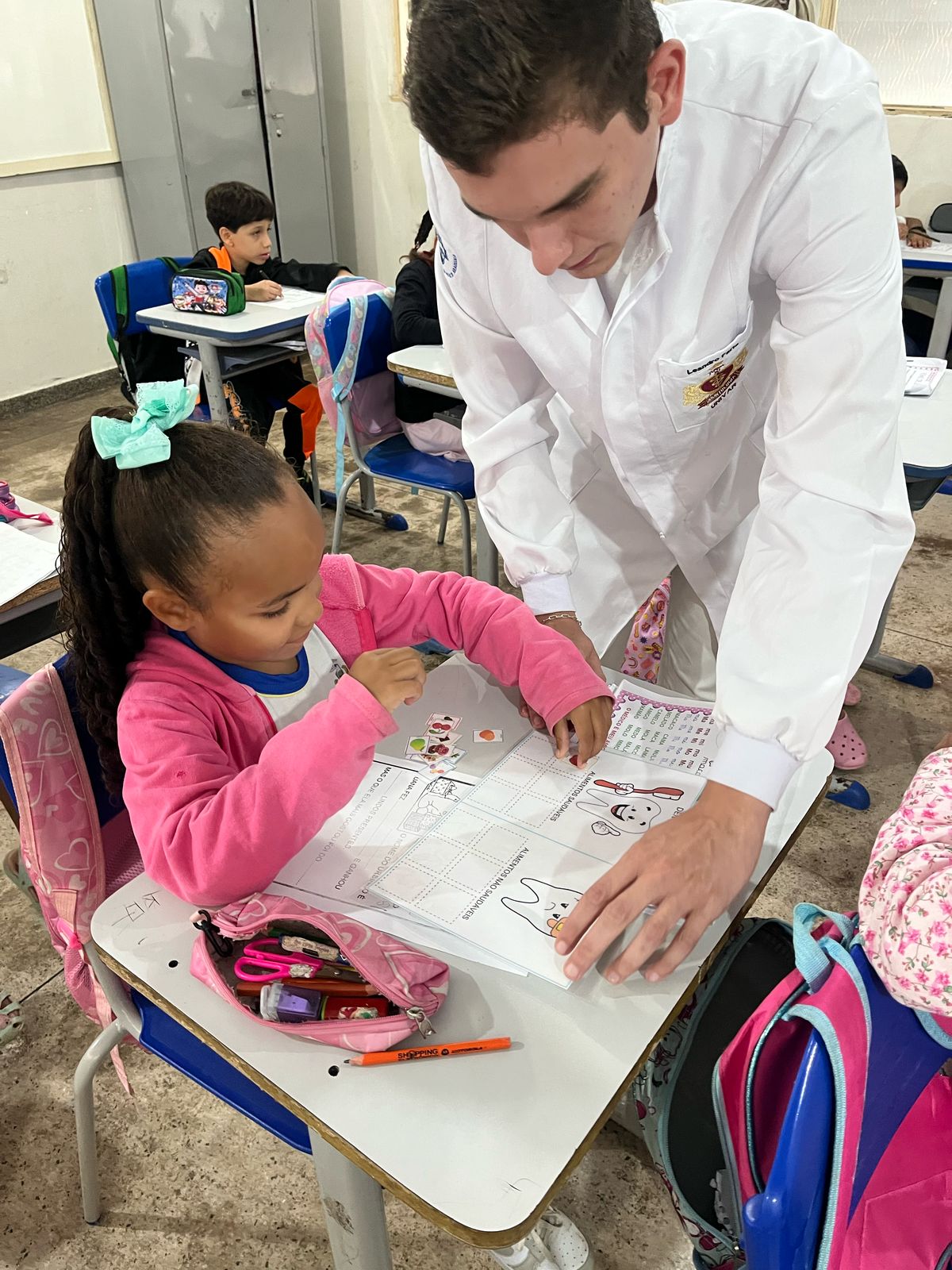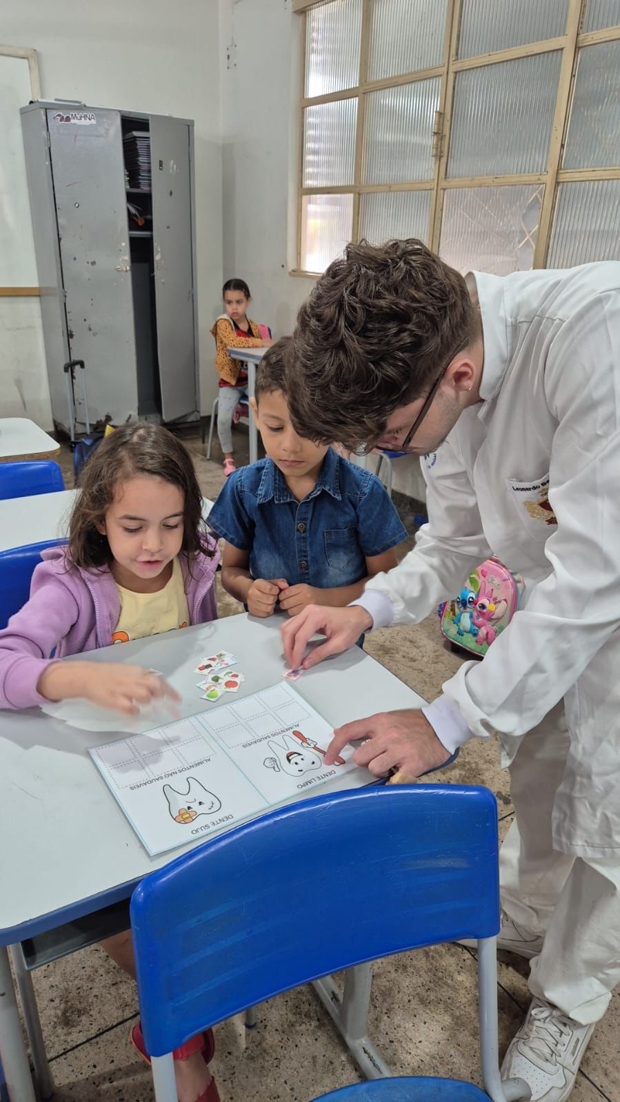 Com o intuito de promover hábitos saudáveis e prevenir doenças bucais desde a infância, acadêmicos do curso de Odontologia do UNIVAR realizaram no dia 24/04, o projeto de extensão interdisciplinar “Pequenos sorrisos, grandes cuidados”. A ação aconteceu nas dependências da Escola Estadual Josê Ângelo dos Santos, com alunos do 1º ano do ensino fundamental I, vinculados à extensão da escola CMEB Elizabeth Sanchez Lacerda.