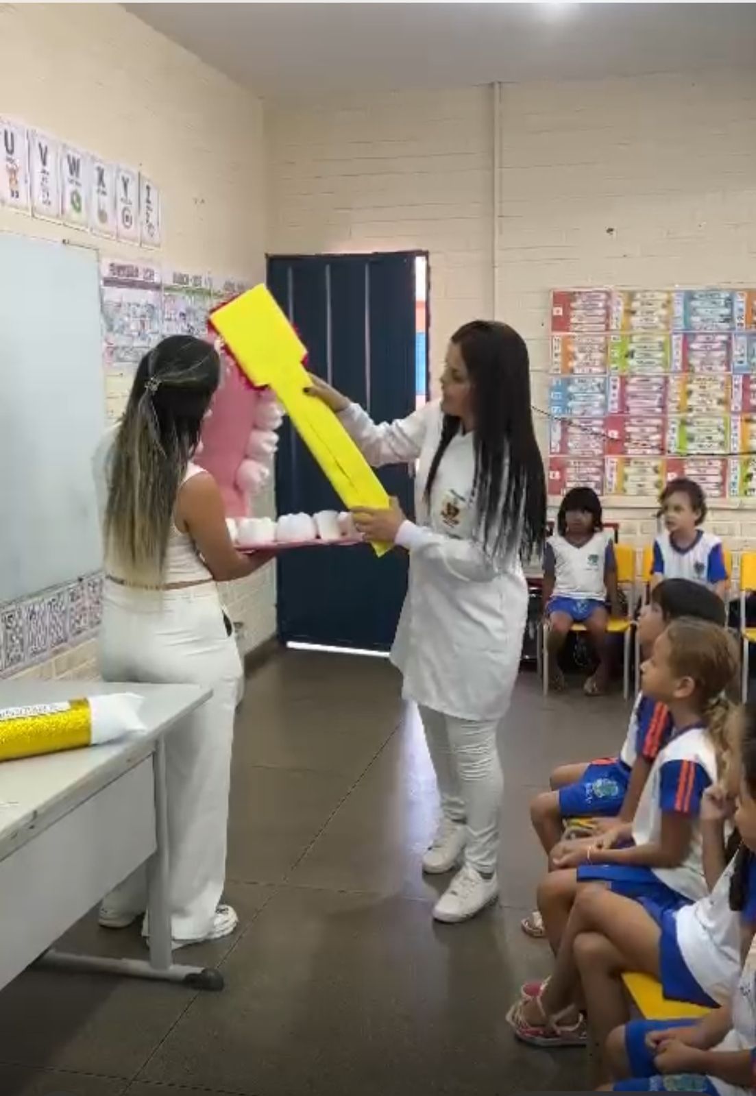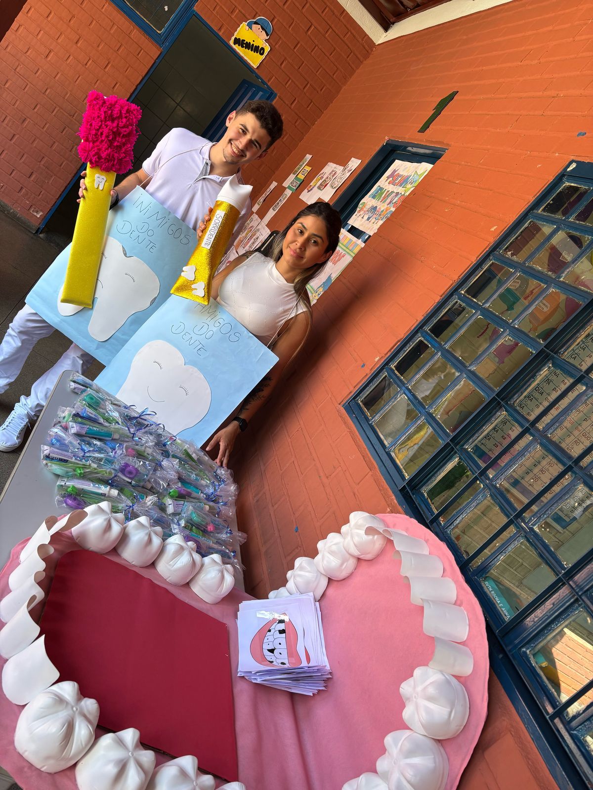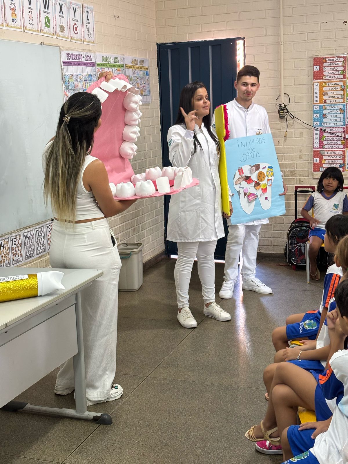 Durante a palestra educativa, os acadêmicos abordaram temas essenciais, como a técnica correta de escovação, o uso do fio dental, a importância da higiene oral após as refeições e antes de dormir, além da influência da alimentação na saúde bucal. Para tornar as explicações mais acessíveis, foram utilizados materiais confeccionados pelos próprios acadêmicos, como uma boca gigante, uma escova e um tubo de creme dental em tamanho grande, que ajudaram na demonstração prática.