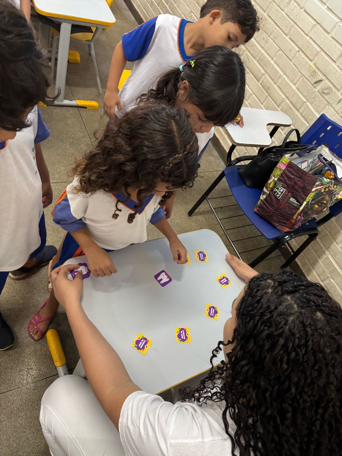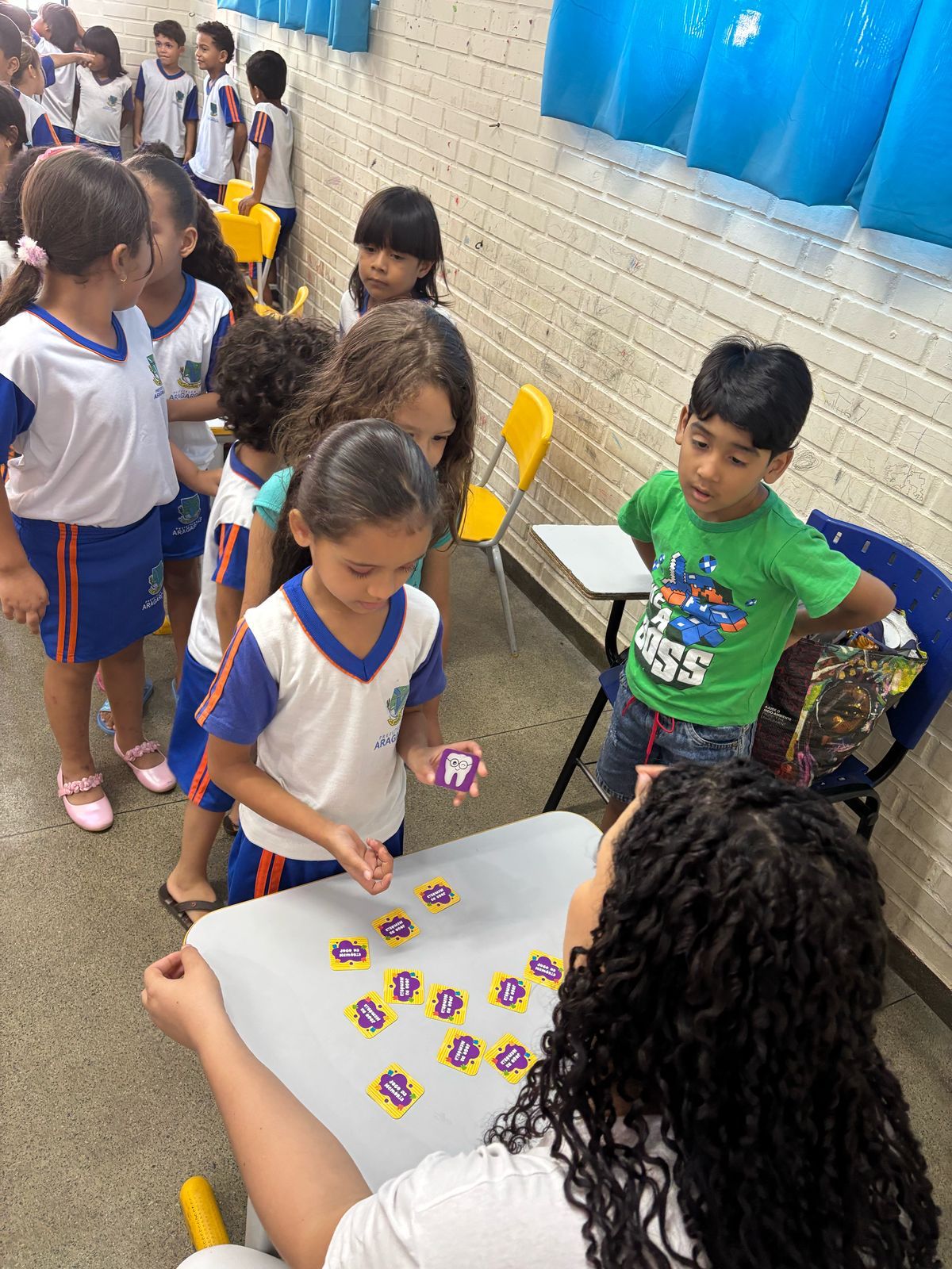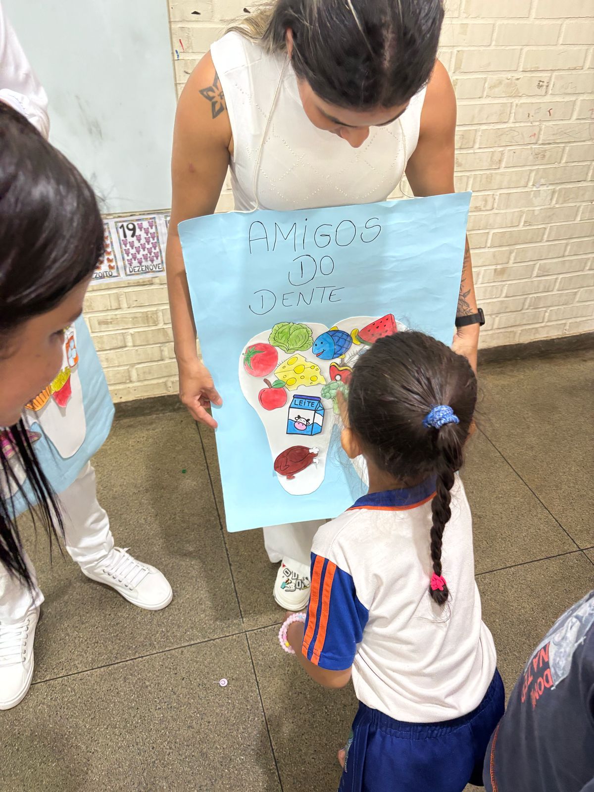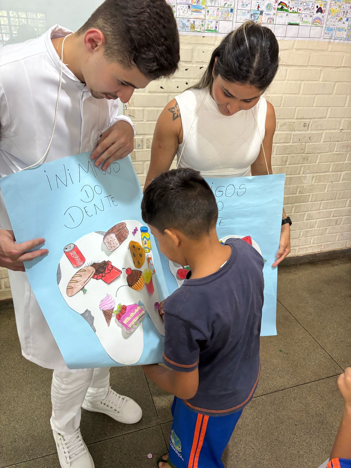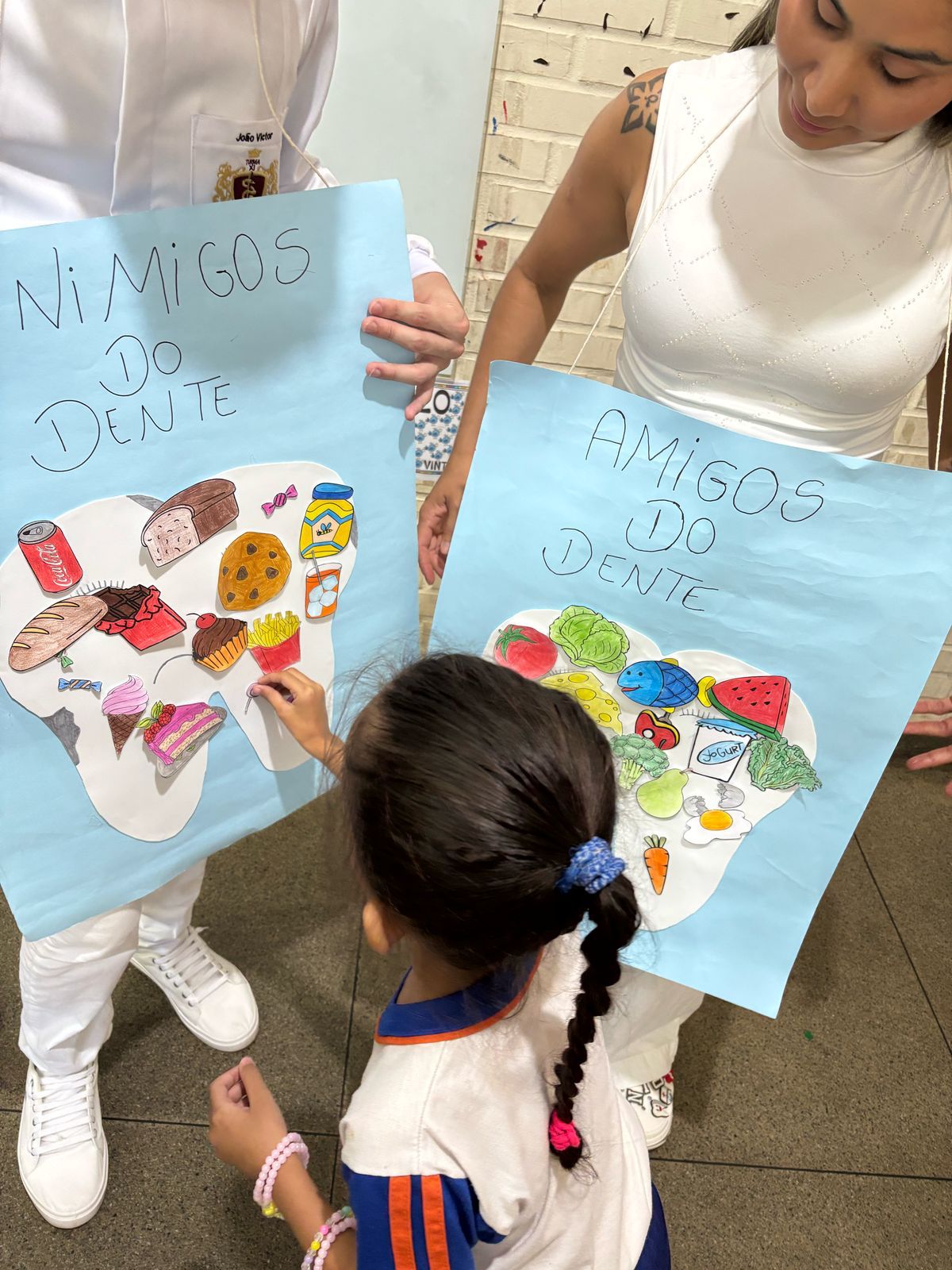 As atividades práticas também chamaram a atenção das crianças. Dois painéis interativos, um com alimentos amigos dos dentes, e outro com alimentos inimigos, permitiram que os pequenos colassem figuras e compreendessem, de maneira participativa, os impactos da alimentação na saúde bucal. Além disso, houve um jogo da memória temático e uma atividade de “escovação” de desenhos de dentes sujos, reforçando a importância da escovação regular de maneira divertida.