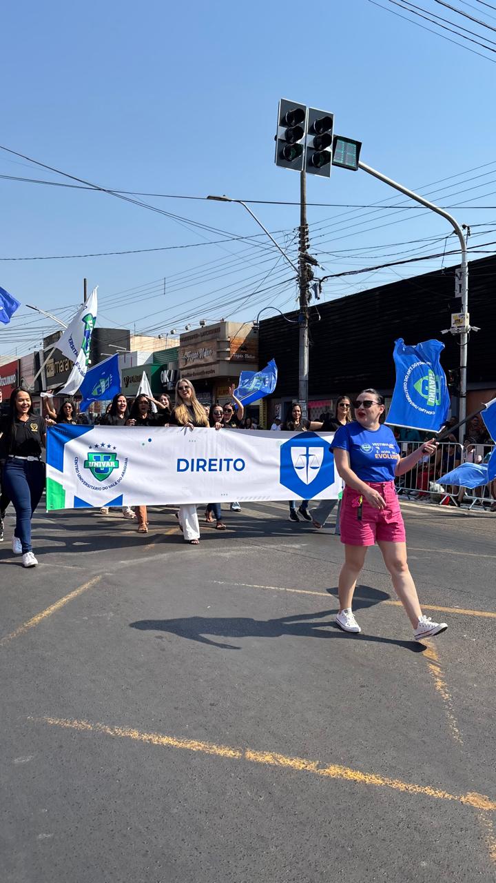 Logo atrás, os Pró-reitores Eduardo Afonso (Administrativo), Gersileide Paulino (Acadêmica) e Tatiana Melo (PROPEX) seguiram carregando uma faixa dedicada à cidade, representando o espírito de união do “time UNIVAR”. Em seguida, colaboradores e acadêmicos desfilaram orgulhosos, segurando faixas com o nome dos cursos, além das bandeiras do UNIVAR, da cidade e do Estado de Mato Grosso.