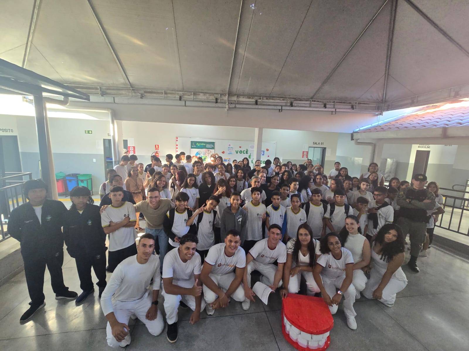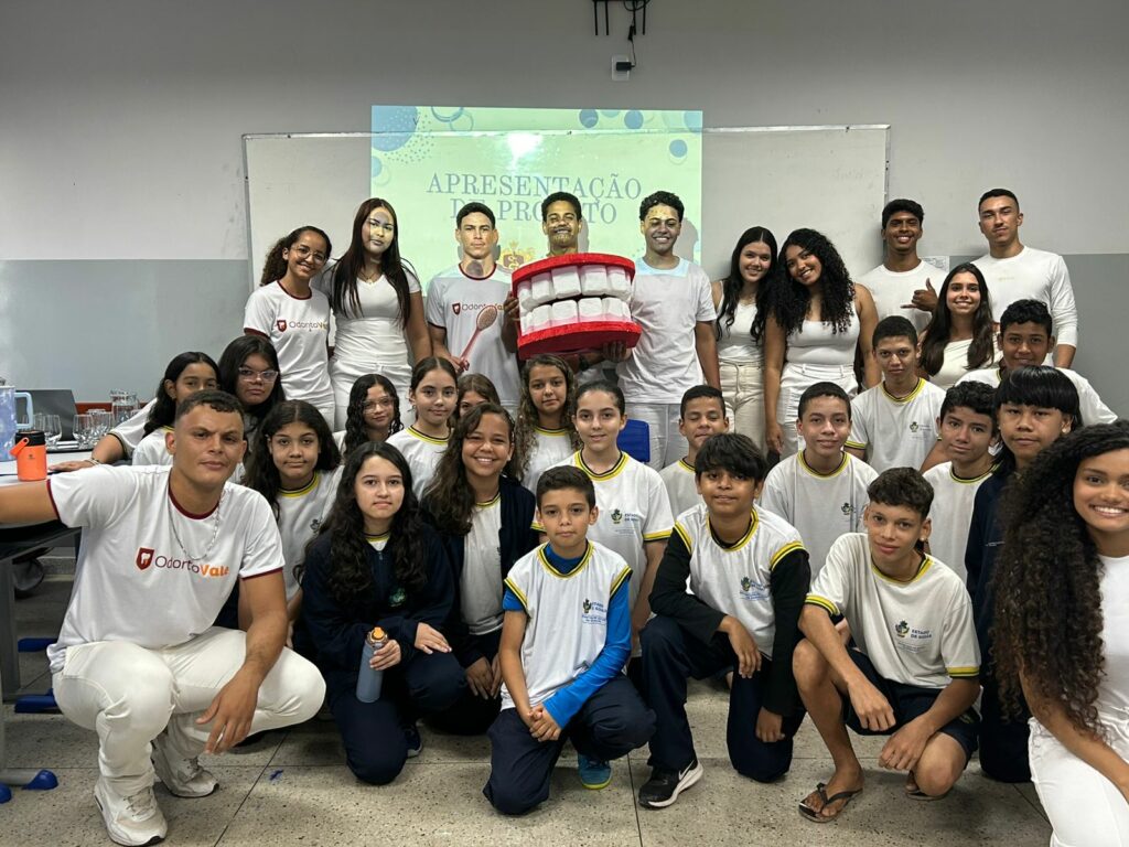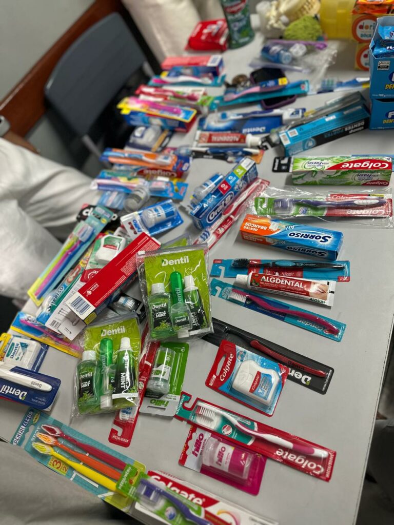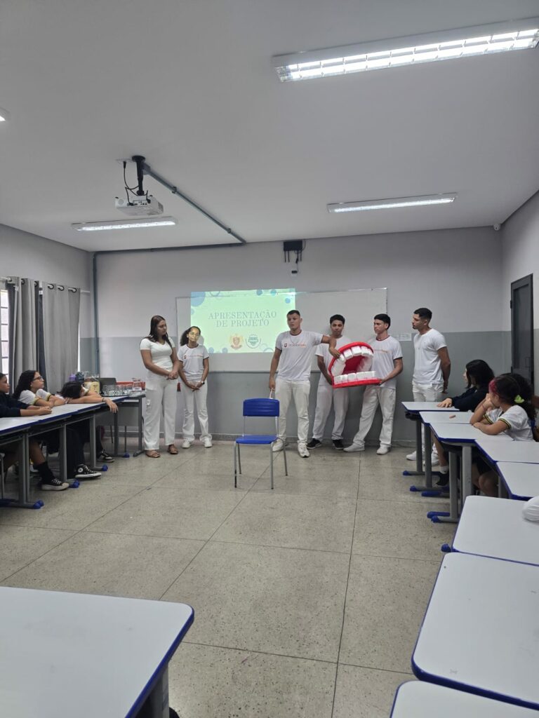 Como parte das ações de responsabilidade social, também foram doados kits de higiene bucal aos estudantes, provenientes do projeto Trote Solidário, iniciativa do curso de Odontologia que incentiva práticas de cidadania e cuidado com a saúde desde a formação acadêmica.