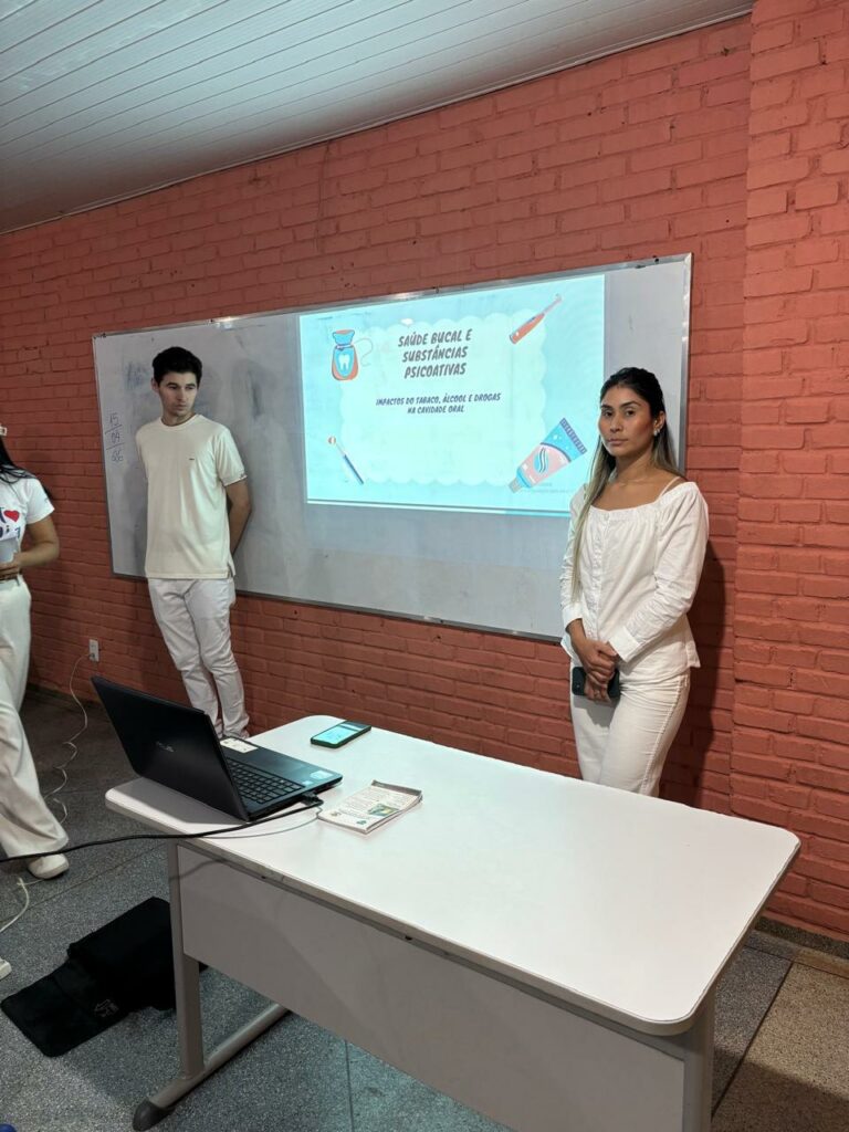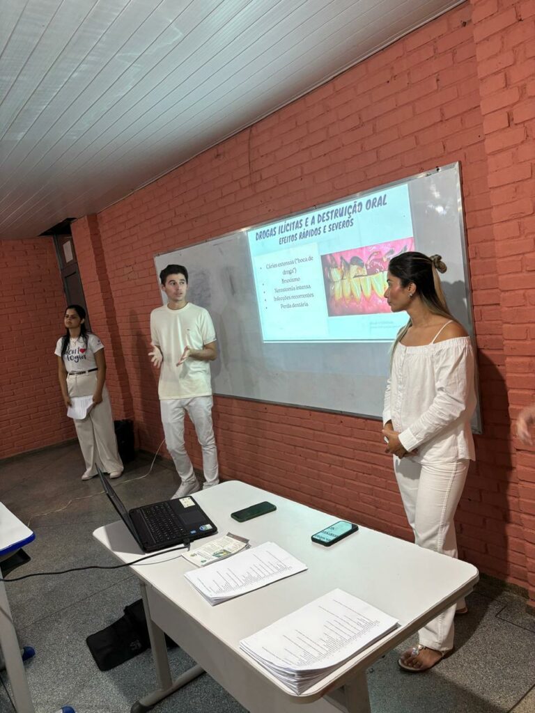 O projeto, intitulado “Impactos do uso de álcool e tabaco na saúde bucal: estratégias educativas para prevenção e conscientização”, foi desenvolvido pelos acadêmicos Fernanda Borguezan, Heloisa Pamela Vilela Silva, Islalia Natiele Araújo, João Victor Castro Ramos, Keyta Vasconcelos dos Santos e Ana Carolina Sales Costa de Souza, dos 3º e 9º semestres.