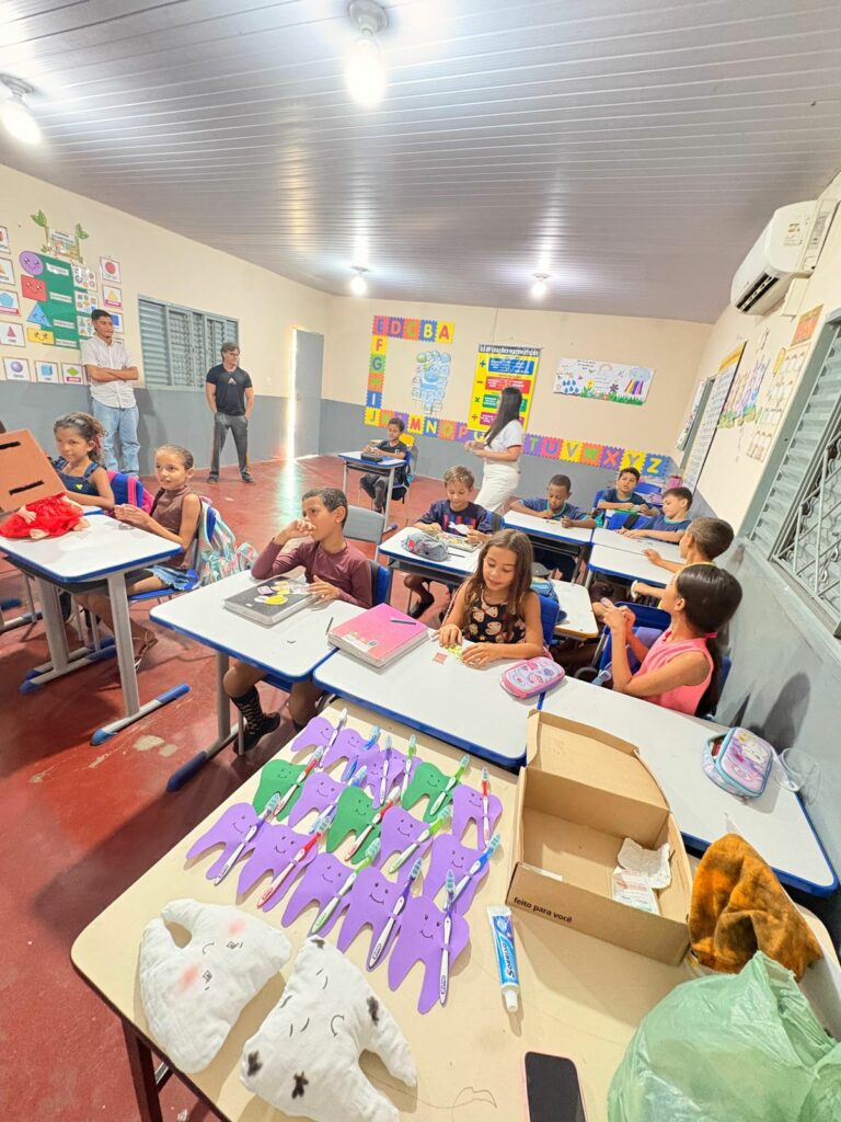 Além das explicações em sala, as crianças receberam escovas dentais e participaram de uma atividade prática de escovação supervisionada. Nesse momento, as acadêmicas acompanharam individualmente os participantes, reforçando o aprendizado e incentivando a aplicação dos cuidados no dia a dia.